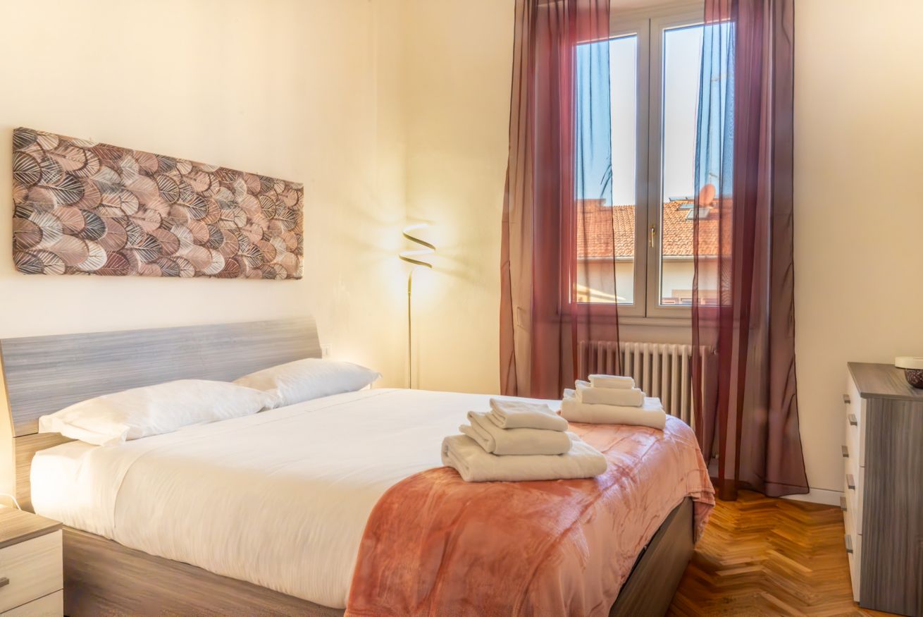 L'appartamento offre una camera matrimoniale accogliente con un letto comodo e un'atmosfera luminosa e rilassante, perfetta per rigenerarsi dopo una giornata trascorsa a esplorare le meraviglie fiorentine.
