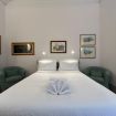Arredamento elegante: la camera è decorata con opere d'arte e arredamenti che creano un ambiente caldo e accogliente. Due poltrone verdi completano l'arredo, offrendo un comodo spazio per rilassarsi.